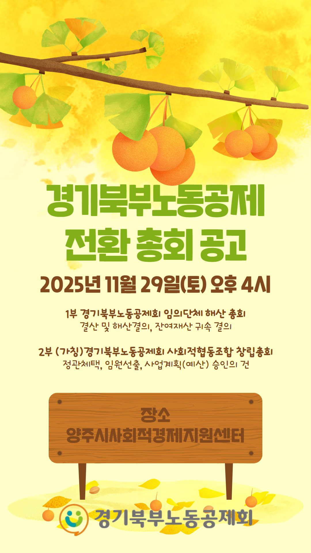 경기북부노동공제회사회적협동조합 전환 총회 소집 공고 경기북부노동공제회를 사회적협동조합으로 전환하기 위한 전환총회(해산 총회 및 창립 총회)를 아래와 같이 개최하고자 하오니, 회원 여러분의 적극적인 참석을 바랍니다. - 아 래 - ○ 일 시 : 2025년 11월 29일(토) 오후 4시○ 장 소 : 양주시사회적경제지원센터(양주시 회천남로 115 옥정천년나무 16단지 1605호 1층)○ 안 건 ▶ 1부 : 경기북부노동공제회 해산 총회 안건 1 2025년 사업 및 결산 보고 안건 2 해산결의의 건 안건 3 잔여재산 귀속 결의의 건 잔여재산을 창립될 사회적협동조합 “(가칭)경기북부노동공제 사회적협동조합”에 승계하고자 함 안건 4 기타 안건 ▶ 2부 : 사회적협동조합 창립 총회 ..
