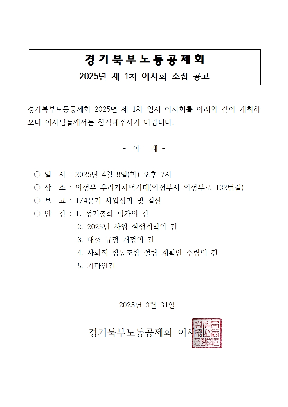 | 경기북부노동공제회 2025년 제 1차 이사회 소집 공고 |