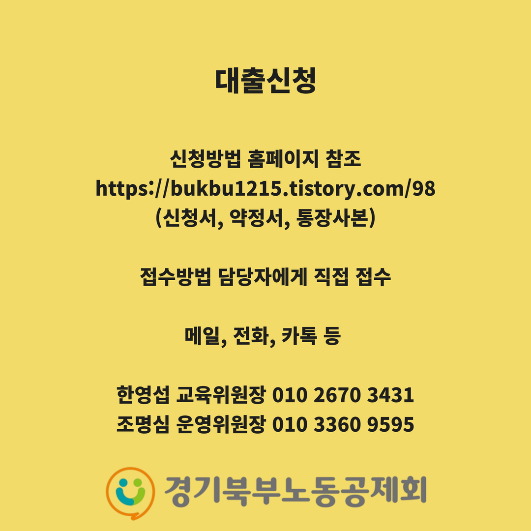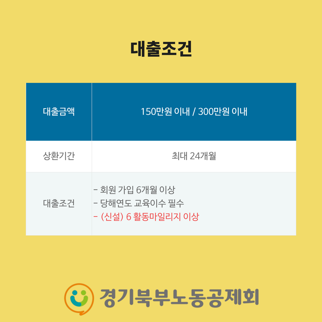 소액 대출· 연 3% 최대 150만원, 300만원· 최대 24개월 분할상환· 기타 확인사항은 약관 참조 - 경기북부노동공제회 가입 후 6개월 이상- 노동공제 교육 이수 (1시간 이상) (노동공제교육은 매년