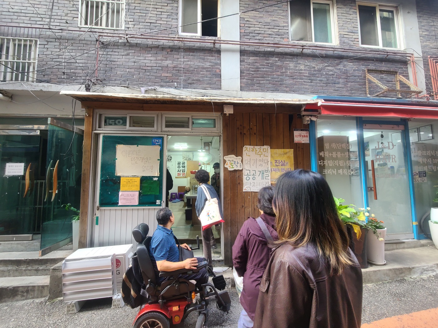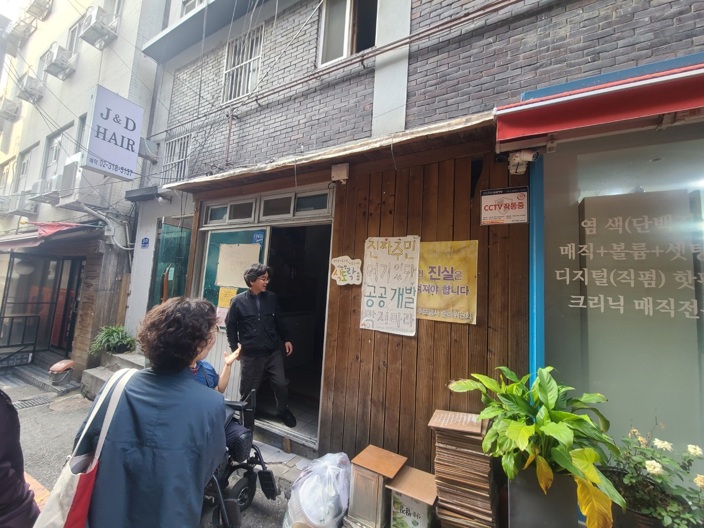 그동안 TV와 유튜브에서만 접했던 일명 동자동 쪽방촌, 그곳에 어떤 삶이 있는 곳인지, 어떻게 해서 우리가 탐방을 갈만한 곳이 되었는지 궁금했는데, 실제로 가 볼 수 있게 되어서 기대가 됐다. 차 한 대가 간신히 들어가는 좁은 골목길 비탈진 언덕에, 전깃줄들이 엉켜있고, 그 아래 우리를 맞이하는 사무실이 있었다. 두 쪽의 유리현관문이 있고, 골목에 유리현관문 아래 신발을 나란히 벗어놓고 사무실로 들어갔다. 인자하고 단정한 모습의 선동수 간사님이 우리 일행을 안내했다. 윤용주대표님, 전 대표님, 사업이사님이 맞이하여주셨다.