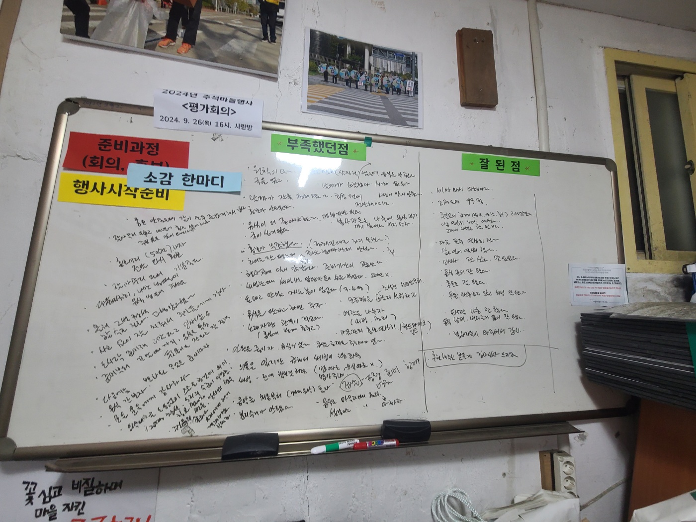 이어서 윤용주 대표님이 우리동네의 여러 활동을 말씀해주셨다. 그 내용이 24년 9월 소식지만 보아도 그동안의 역사를 가늠케 한다. 주민지도자과정 참석, 13회 추석마을 행사, 9차 부탄가스 공동구매사업, 141회 마을 청소, 점심 잔치국수, 병원동행, 9월에 돌아가신 4분의 조문, 3분의 무연고 공영장례, 연대방문객 맞이하기, 주민‧생활‧협동관련 연대활동, 국내외 반빈곤연대활동등이 소개되어있다. 주민활동의 살아있는 역사를 보는 듯하다.
