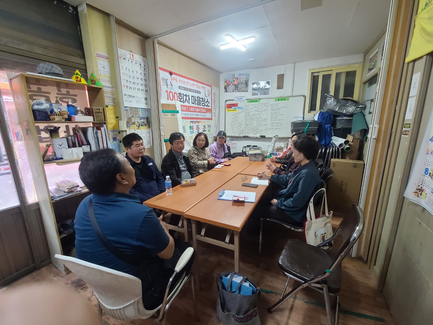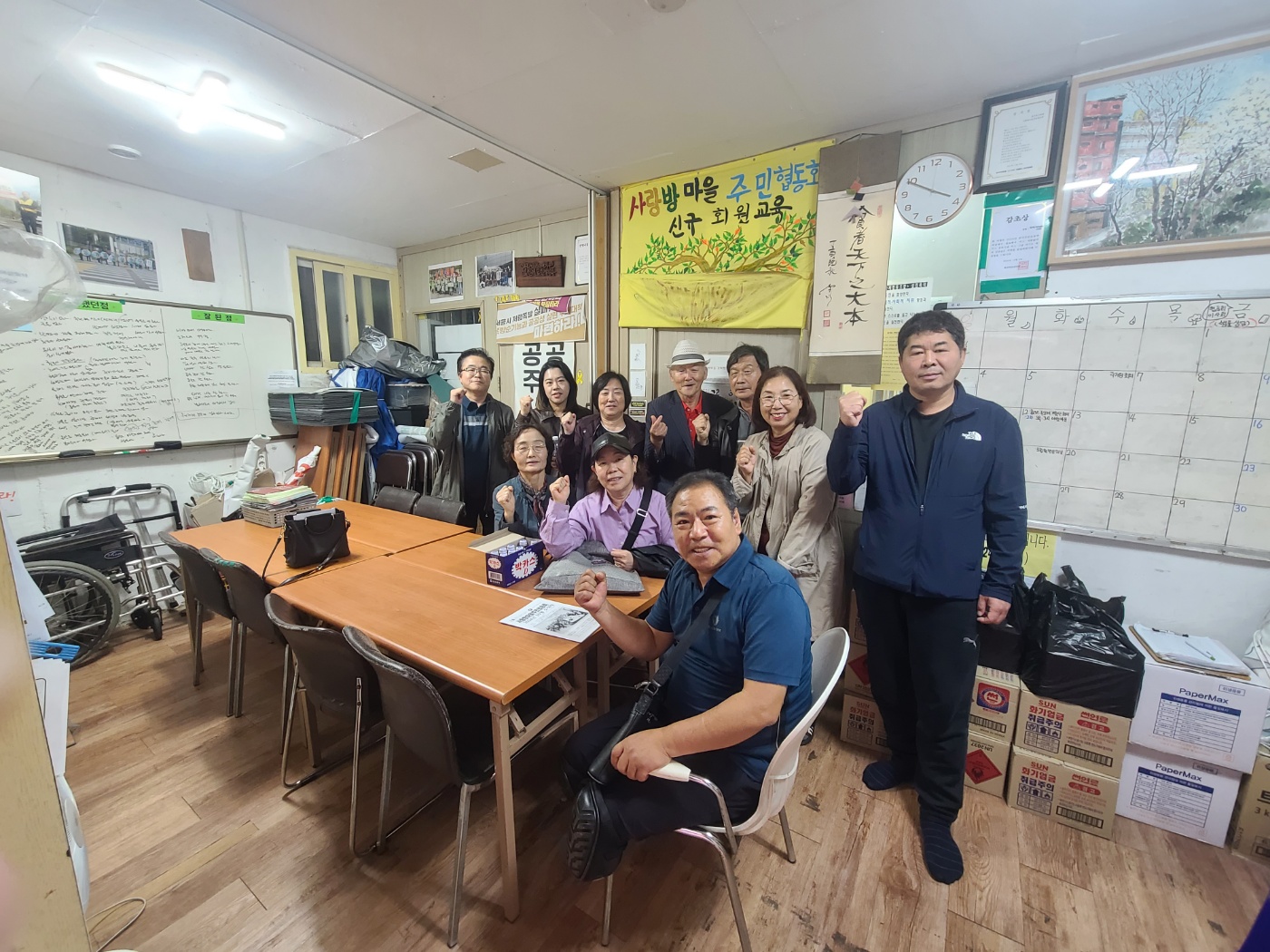 이런 활동들이 가능하기 까지 어떠한 아픔과 노력들이 있었을까? 이 사무실의 현관 유리창이 수차례 깨지고, 주먹다짐이 불신과 신뢰의 마음이 엎지락뒤치락 하며, 동지애를 만들어낸 파노라마가 그려진다. 삶의 터전이 위태로운 곳에서 그만큼 믿기 어려운 환경에서, 몸과 마음을 다하여, 서로 상부상조하며, 지금의 관계를 만들어내었다. 우리가 마시는 음료도 주민이 놓고 가신거라 하신다. 따뜻한 인정이 흐르는 것이 느껴진다. 82세 멋쟁이신사 전 대표님, 마을사업, 방범활동도 함께 하시는 이사님, 결개가 의연해보이시는 화가이자 대표님이 그동안의 활동에 대해서 기쁨으로 뿌듯함으로 여기며 함께 하는 연대가 얼마나 소중한 거듭 이야기하며 소식을 주고받자고 말씀하셨다.