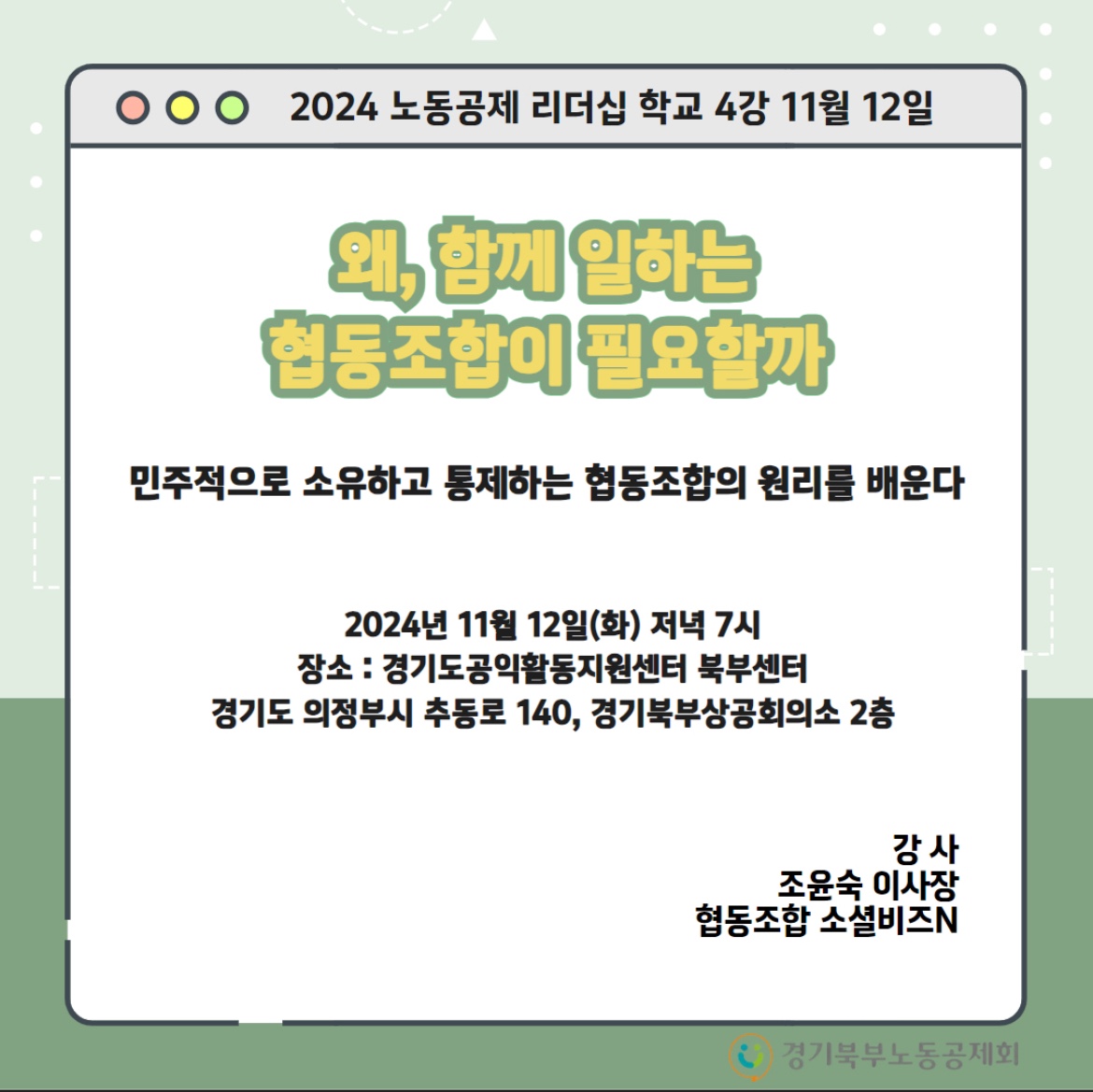 | 노동공제리더십학교 5강 모집 사회적협동조합 경영을 배우자 (0) | 2024.11.13 |