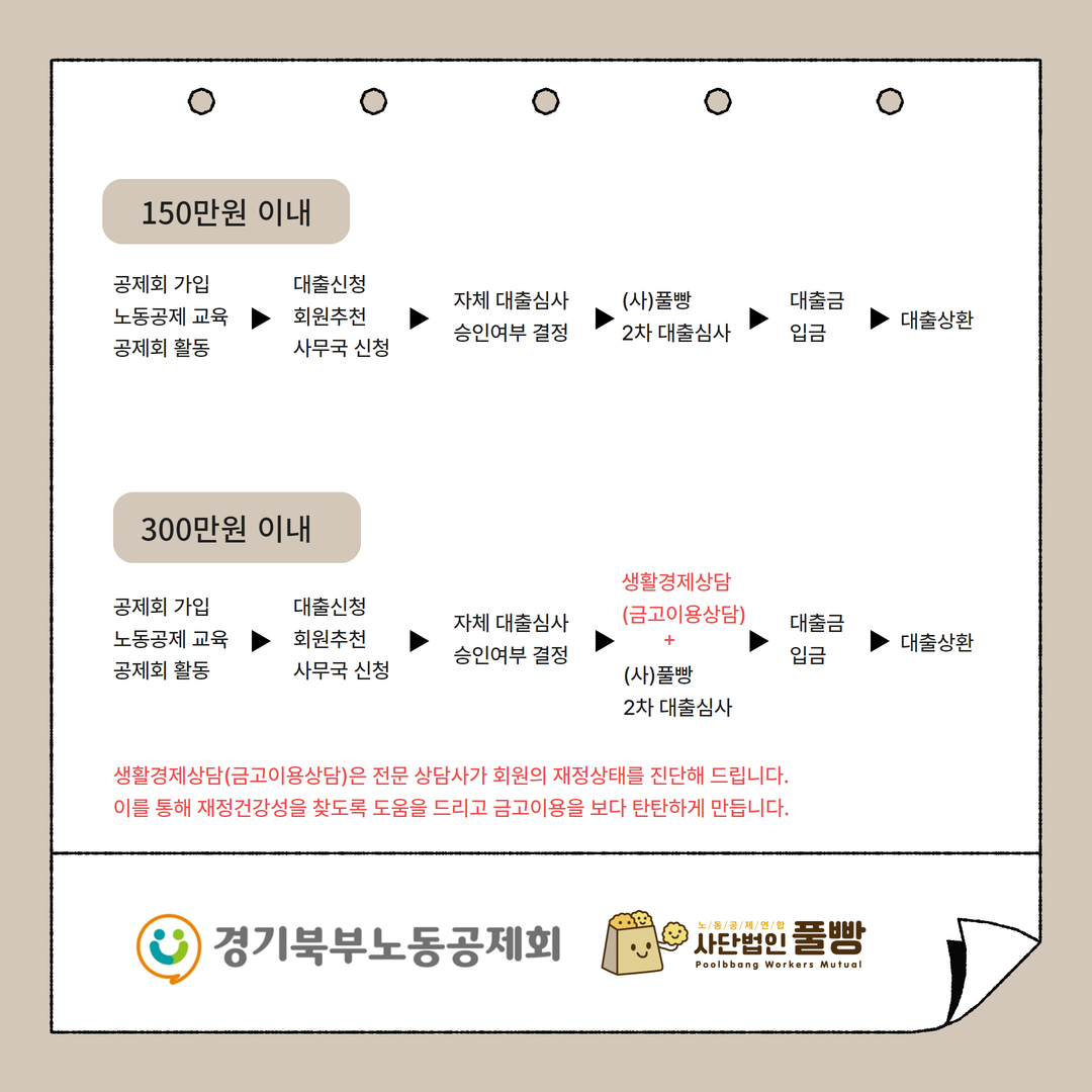 ‘소액신용대출’운영세칙 제정 : 2024. 09. 09.1차 개정 : 2025. 04. 08. 제1장 총 칙 제1조(목적) 본 규정은 경기북부노동공제회 회원에게 제공되는 ‘소액신용대출사업’(이하 ‘대출사업’)의