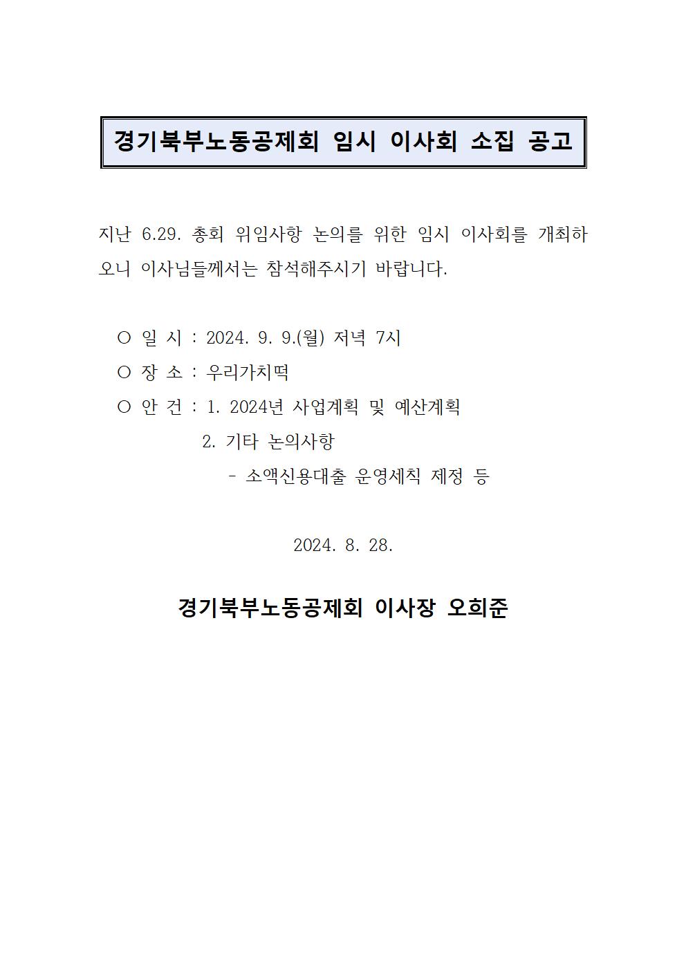 경기북부노동공제회 제5차 임시 이사회 소집 공고 경기북부노동공제회 제5차 임시 이사회 소집 공고 경기북부노동공제회 제 5차 임시 이사회를 아래와 같이 개최하오니 이사님들께서는 참석해주시기 바랍니다. 〇 일 시 : 2024. 11. 7.(목) 저녁 7시 〇 장 소 : 우리가치떡카페 〇 안 건 : 1. 우리공제적금 만기에 따른 홍보 방안 2. 새로운 공제 품목(인생여행적립공제) 추진 건 3. 기타사항 2024. 10. 28. 경기북부노동공제회 이사장 공지사항 2024.10.28