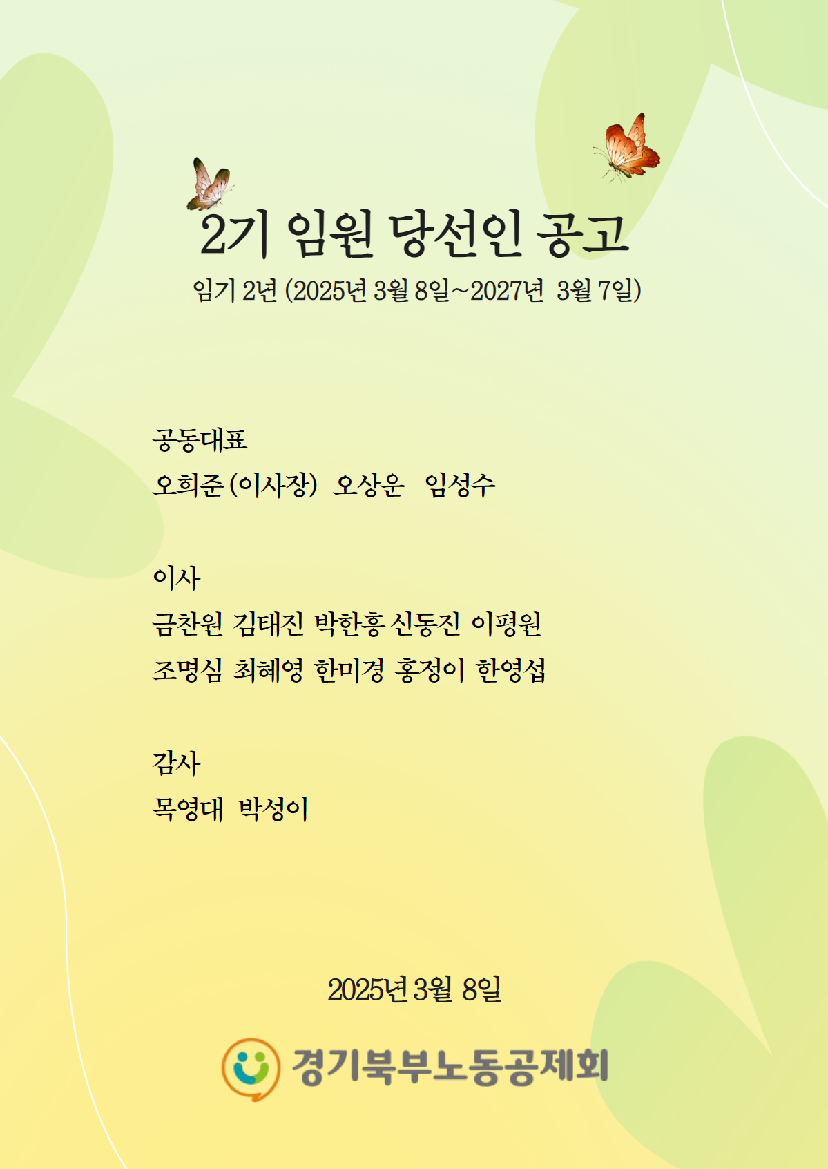2025년 총회준비위원회 회의결과 ❍ 2025.2.18.(화) 오후 5시❍ 우리가치떡 (의정부)❍ 참석 : 12명 (오희준, 박주동, 박한흥, 임성수, 최혜영, 한미경, 홍정이, 조명심, 한영섭, 목영대, 신동진, 김태진)  1. 공유 및 보고사항❍ 전차 회의록 회람❍ 공제회 현황 및 운영사항 보고 ▶ 회계결산 부분 미흡, 차기 이사회부터 정례화  2. 논의 및 결정사항 1) 1호 안건 : 임원 임기 말료에 따른 대책 ▶ 1기 이사회, 임기 말료에 따라 2025년 총회 준비위원회로 전환. ▶ 이번 정기총회(3월 8일)에서 2기 임원 선출하기로 함. (정관에 따라) ▶ 선거관리위원장 선임 (박주동) ▶ 임원 정수 개정필요, 7인 ~ 15인 이내로 이번 총회에서 정관 개정  2) 2호 안건 : 2024년 ..