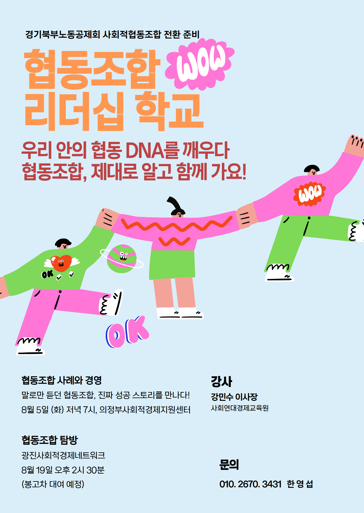 경기북부노동공제회 사회적협동조합 전환 준비 협동조합 리더십 학교 우리 안의 협동 DNA를 깨우다 협동조합, 제대로 알고 함께 가요! 말로만 듣던 협동조합, 진짜 성공 스토리를 만나다! 8월 5일 (화) 저녁 7시 (협동조합 사례와 경영) 강사 : 강민수 이사장 사회연대경제교육원 장소 : 의정부사회적경제지원센터 의정부시 용민로 373-17 2층 교육장 탐방 : 광진사회적경제네트워크 일시 : 2025년 8월 19일 오후 2시 30분 * 봉고차 대여 예정 신청 : https://forms.gle/ouNFKqxYPQGyw2Y4A문의 : 한영섭 010. 2670. 3431 주관 : 경기북부노동공제회 2025 협동조합 리더십 학교경기북부노동공제회 사회적협동조합 전환 준비 협동조합 리더십 학교..